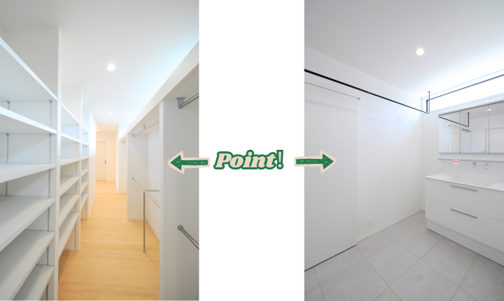 隣にあるファミリークローゼットに洗濯物をすぐ収納できる家事楽動線になっています。